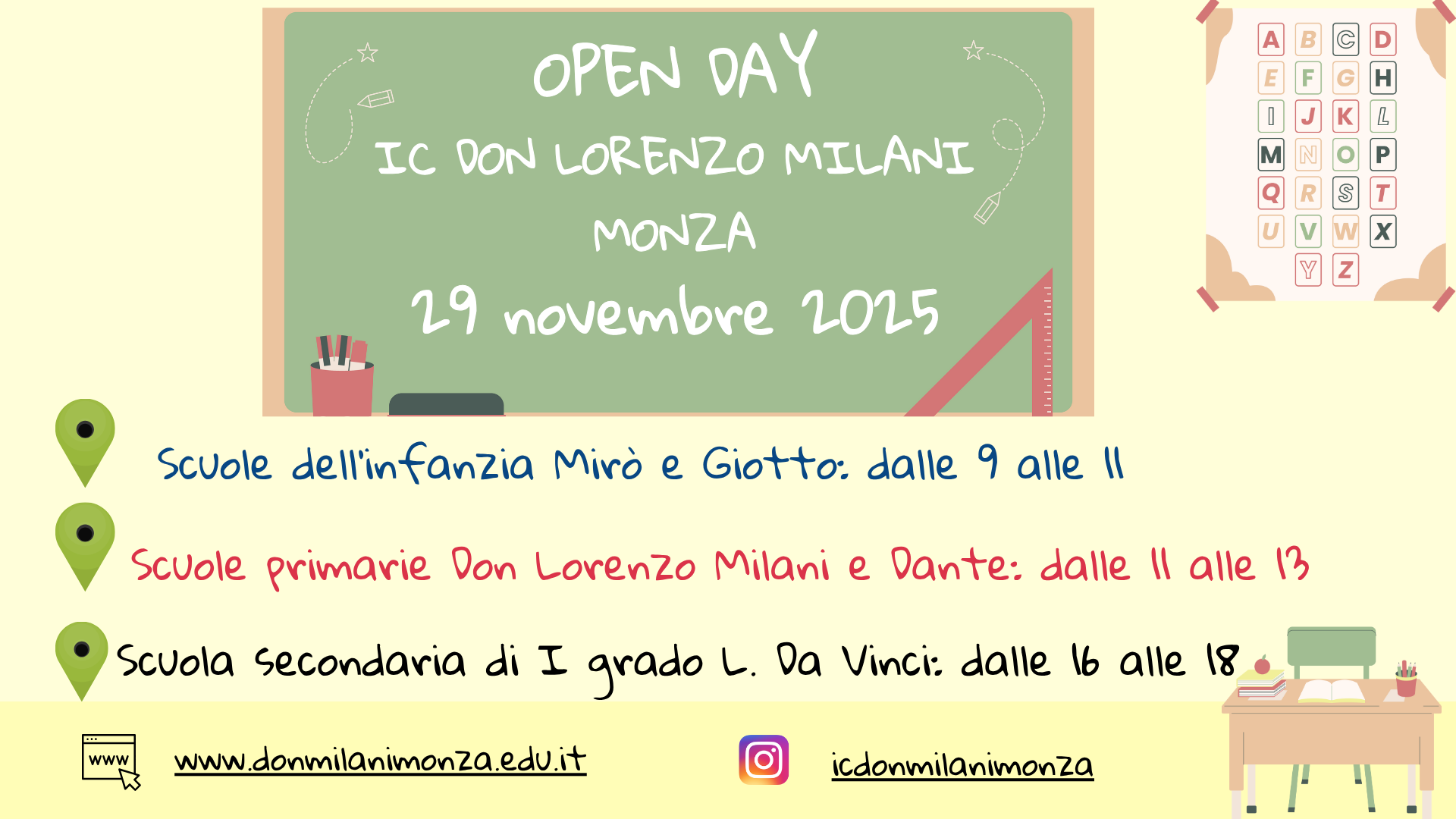 Il 29 novembre vieni a trovarci! Porte aperte per le scuole dell’infanzia Giotto e Mirò, primarie Don Milani e Dante e secondaria di I grado L. da Vinci.